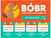Przypominamy, że w dniach 17,11.2025(poniedziałęk), 18.11.2025(wtorek) i 21.11.2025(piątek) odbędzie się w naszej szkole XX Międzynarodowy Konkurs Informatyczny BÓBR.